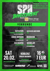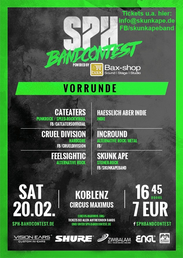 Am 20. Februar nehmen wir an der Vorrunde beim SPH Bandcontest im Circus Maximus in Koblenz teil. Wir würden uns riesig freuen, wenn ihr uns an dem Abend unterstützt! Dazu braucht ihr nicht mehr zu tun, als vorbeizukommen, eure Stimme für uns abzugeben und mit uns fett die Bude wegzufeiern. Tickets gibt's direkt bei UNS per Mail oder über SPH.
